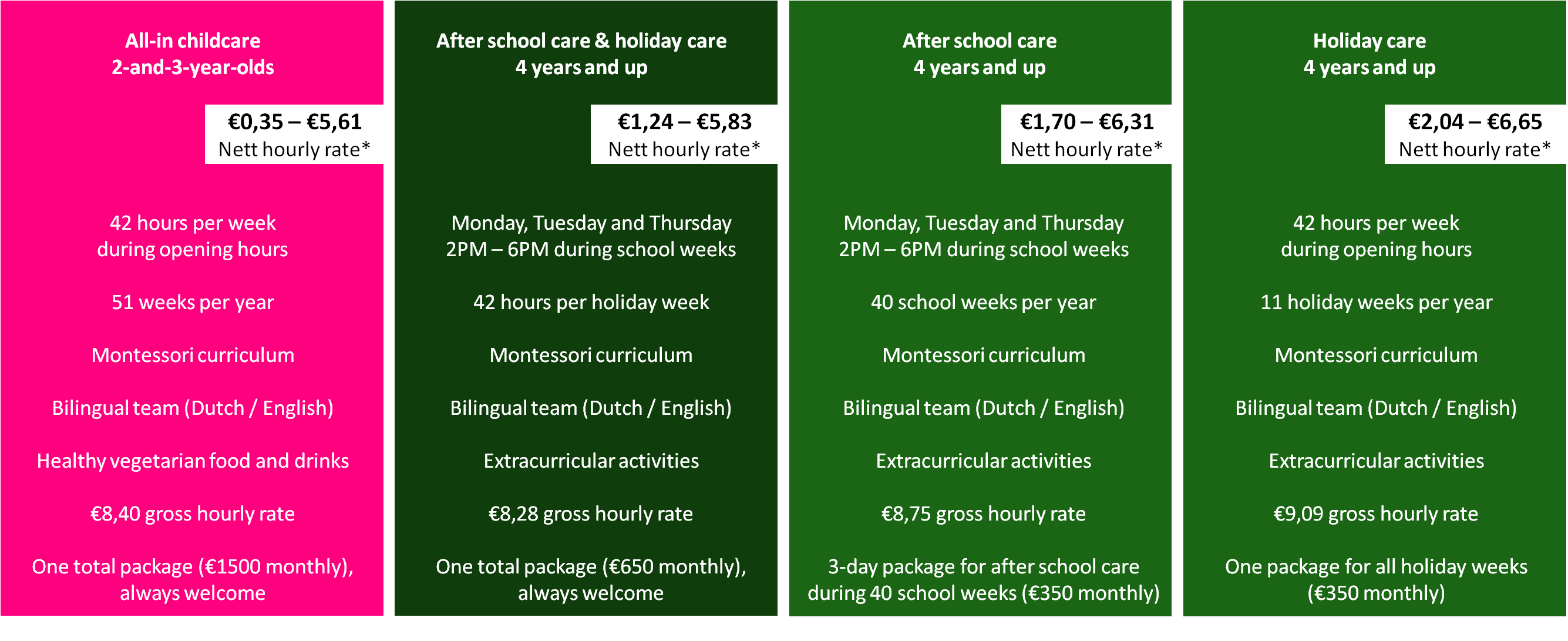 We also provide holiday care for 11 out of 12 holiday weeks. In those weeks we follow our normal schedule of 42 hours per week. It is now possible to express your interest for after school and/or holiday care by completing the pre-registration form. If you are interested, please let us know before May 13th.
